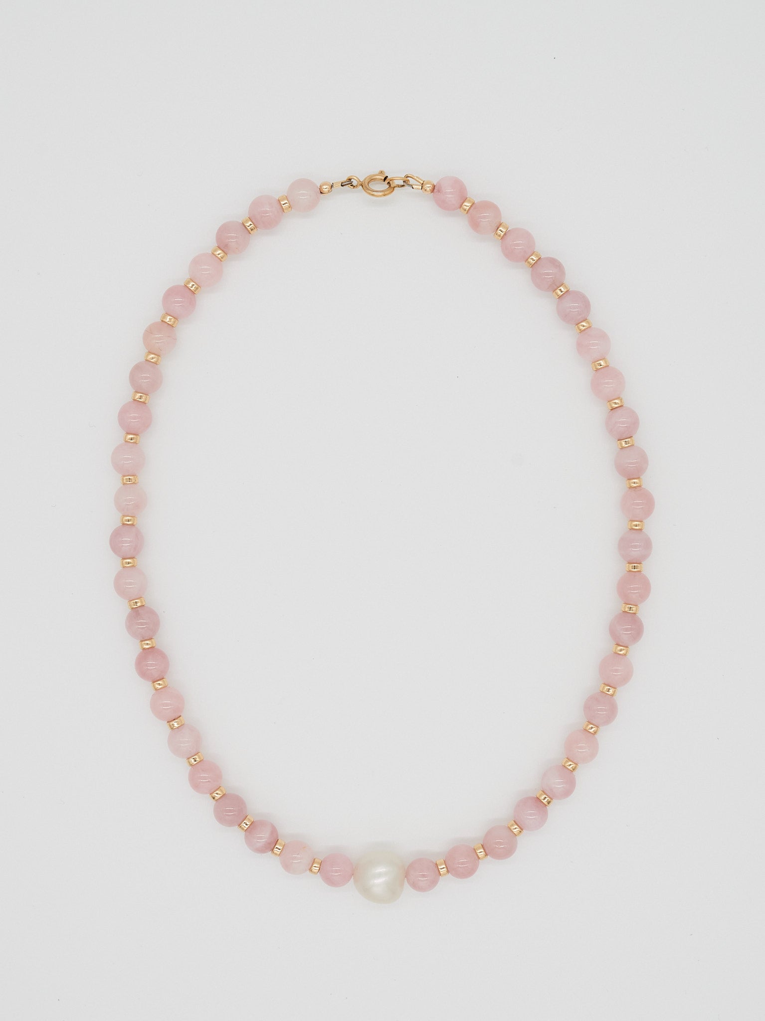 The Daydream Necklace is a playful yet polished piece, strung with soft and romantic, rose quartz and punctuated by warm 14k gold-filled spacers, creating a gentle glow with a tender, feminine spirit.