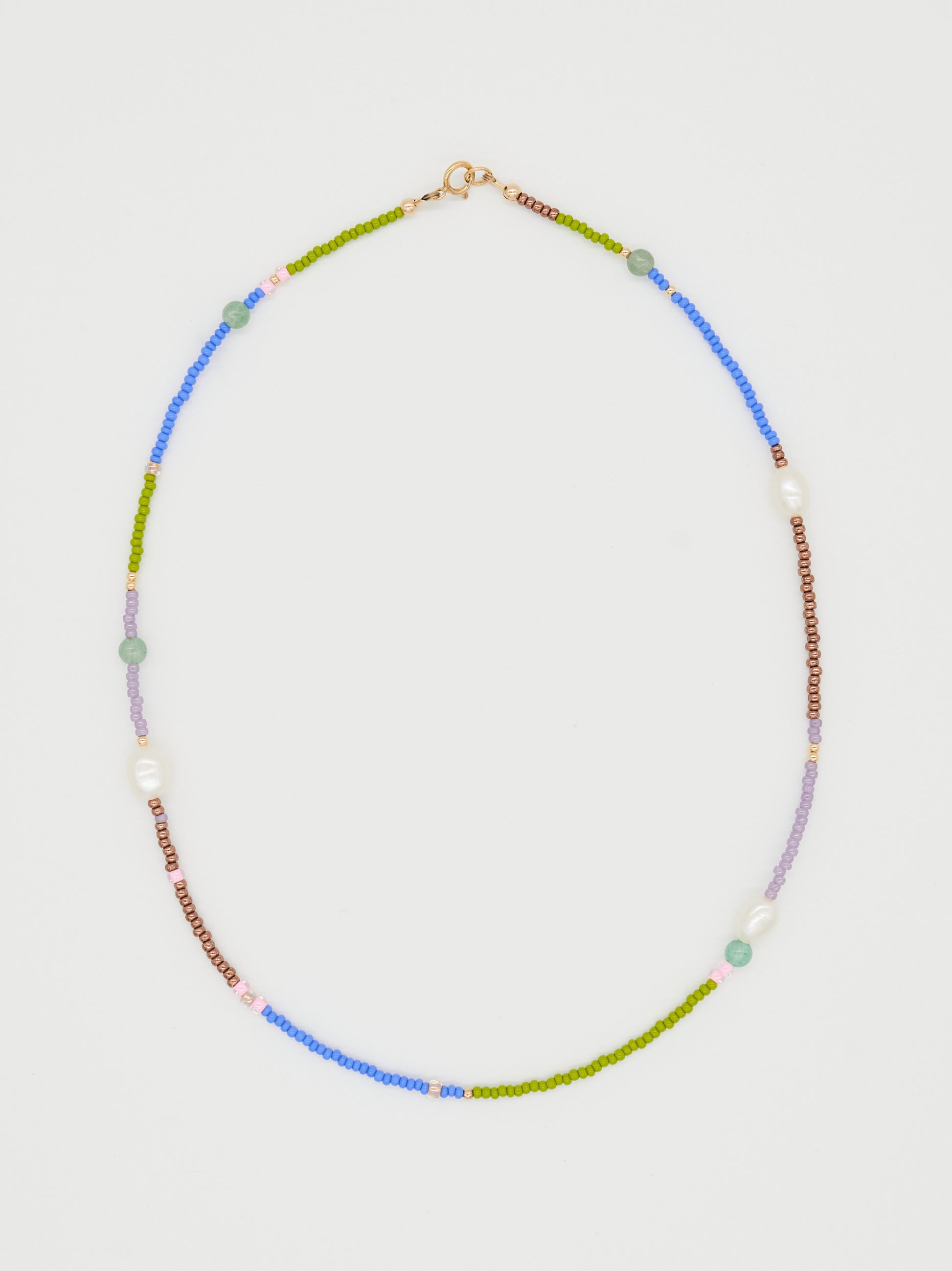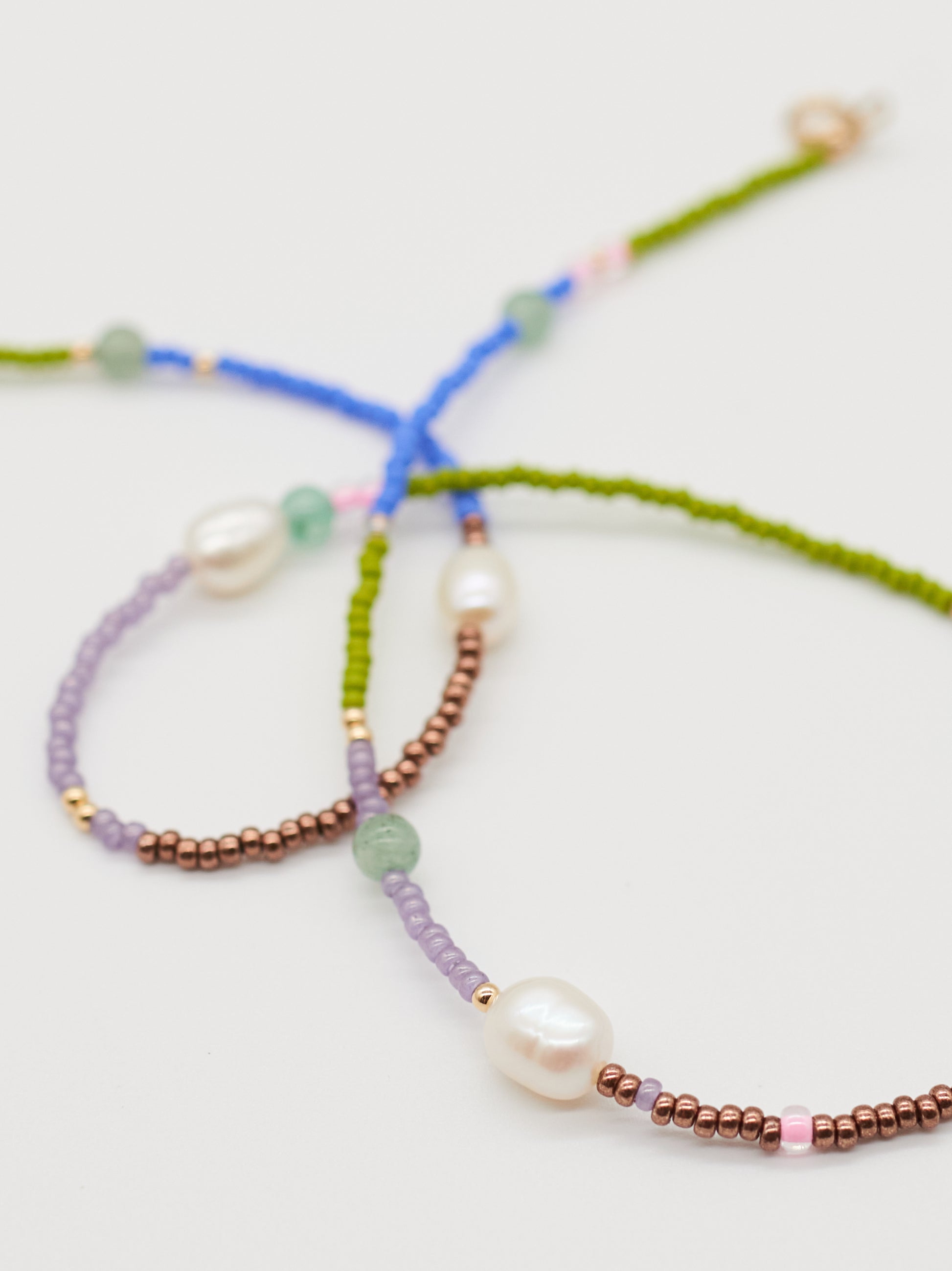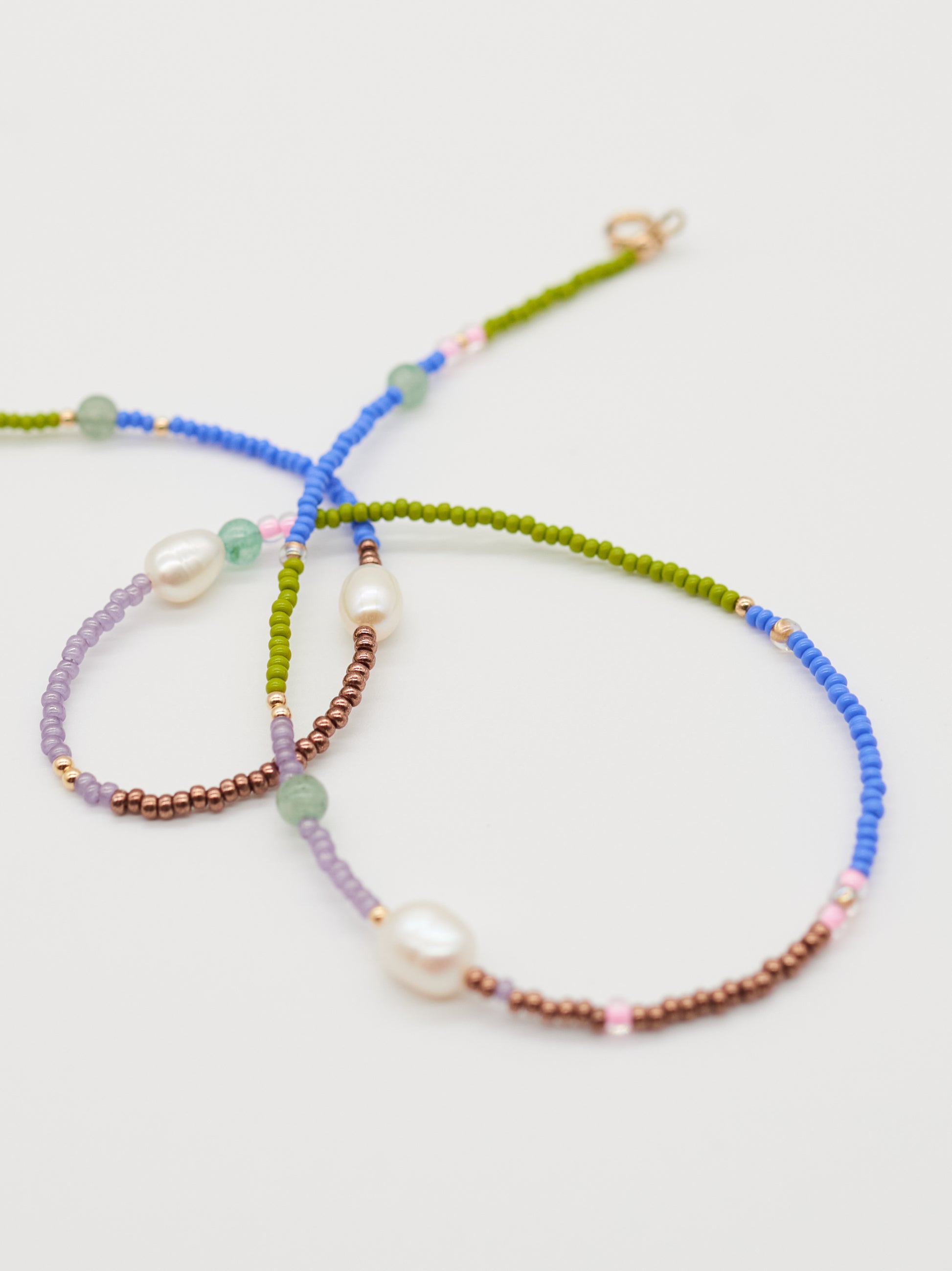 A joyful blend of colour and craftsmanship - delicate yet expressive, celebrating creativity and contrast. Handcrafted from Czech and Japanese glass beads, freshwater pearls, semi-precious stones, and golden accents, each section is thoughtfully composed with its own rhythm and charm. Like a mosaic of memories, it’s artful, airy, and endlessly wearable.