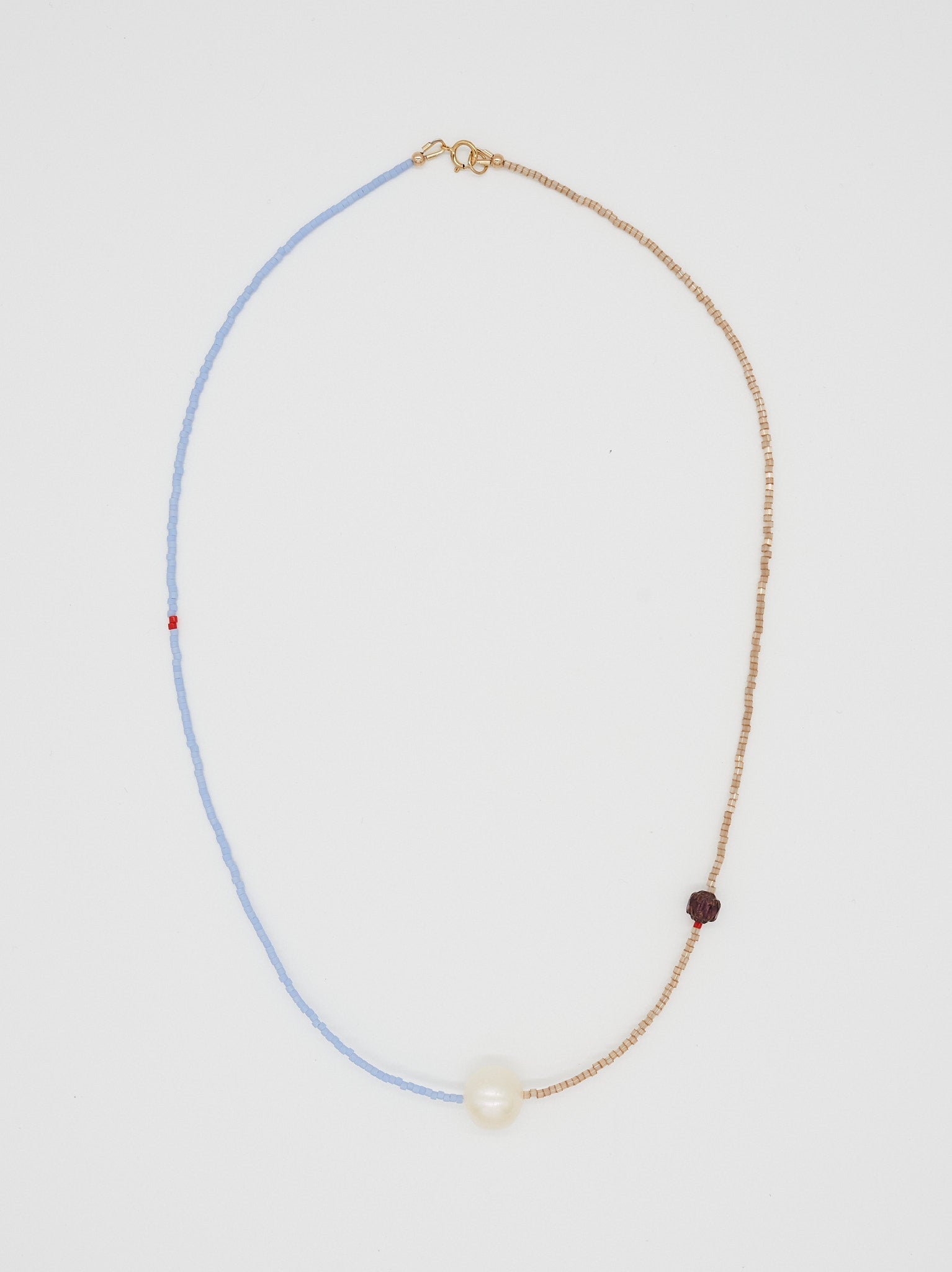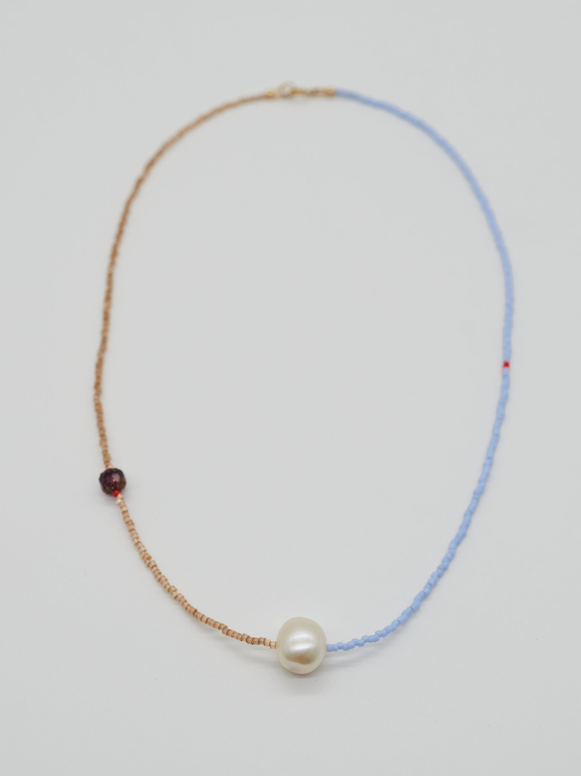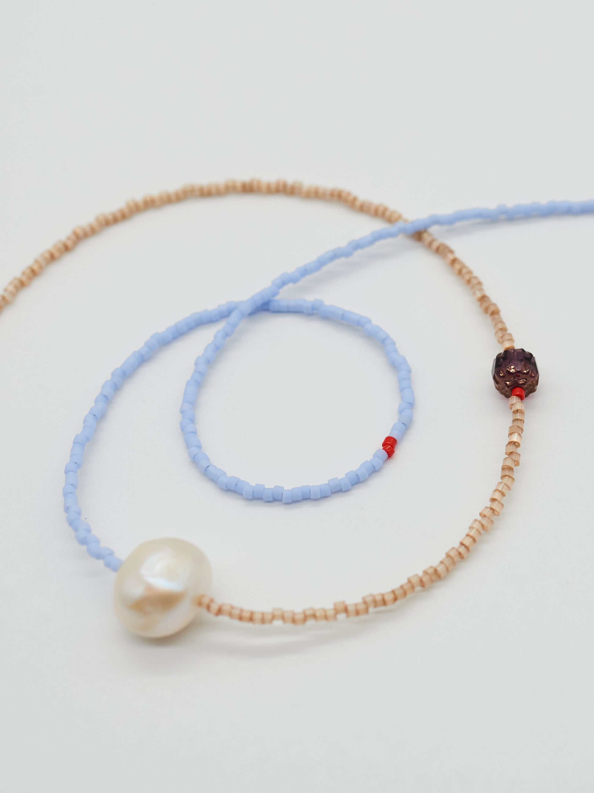 The Golden Pearl Necklace is a study in contrast and elegance, combining gold and soft blue Czech glass seed beads in a unique, asymmetrical flow. At its heart lies a luminous baroque pearl, its organic shape enhancing the necklace’s natural beauty. Tiny red seed beads punctuate the design, acting as energetic accents that add a touch of unexpected vibrancy. A piece that speaks to both classic sophistication and modern artistic expression.