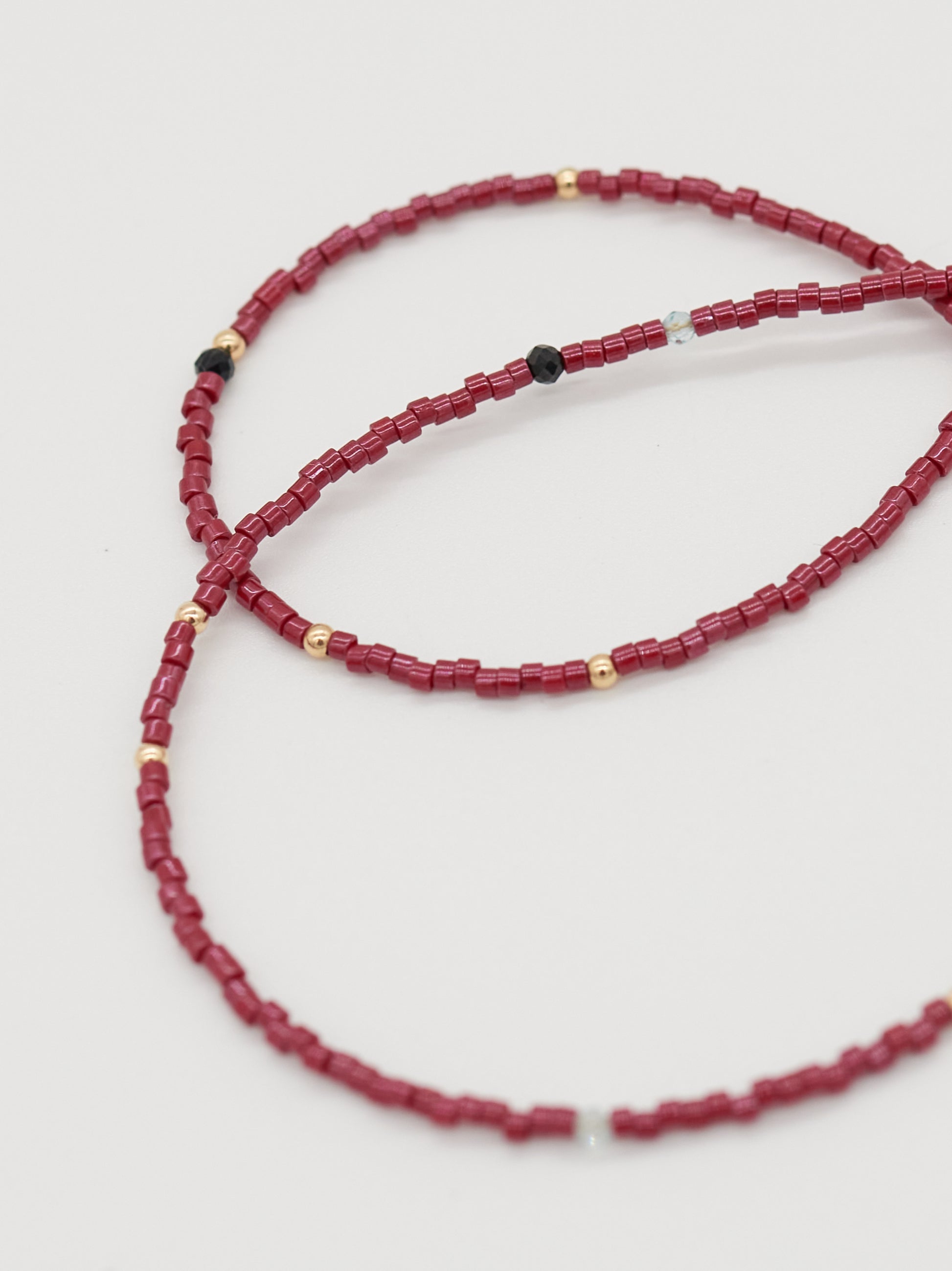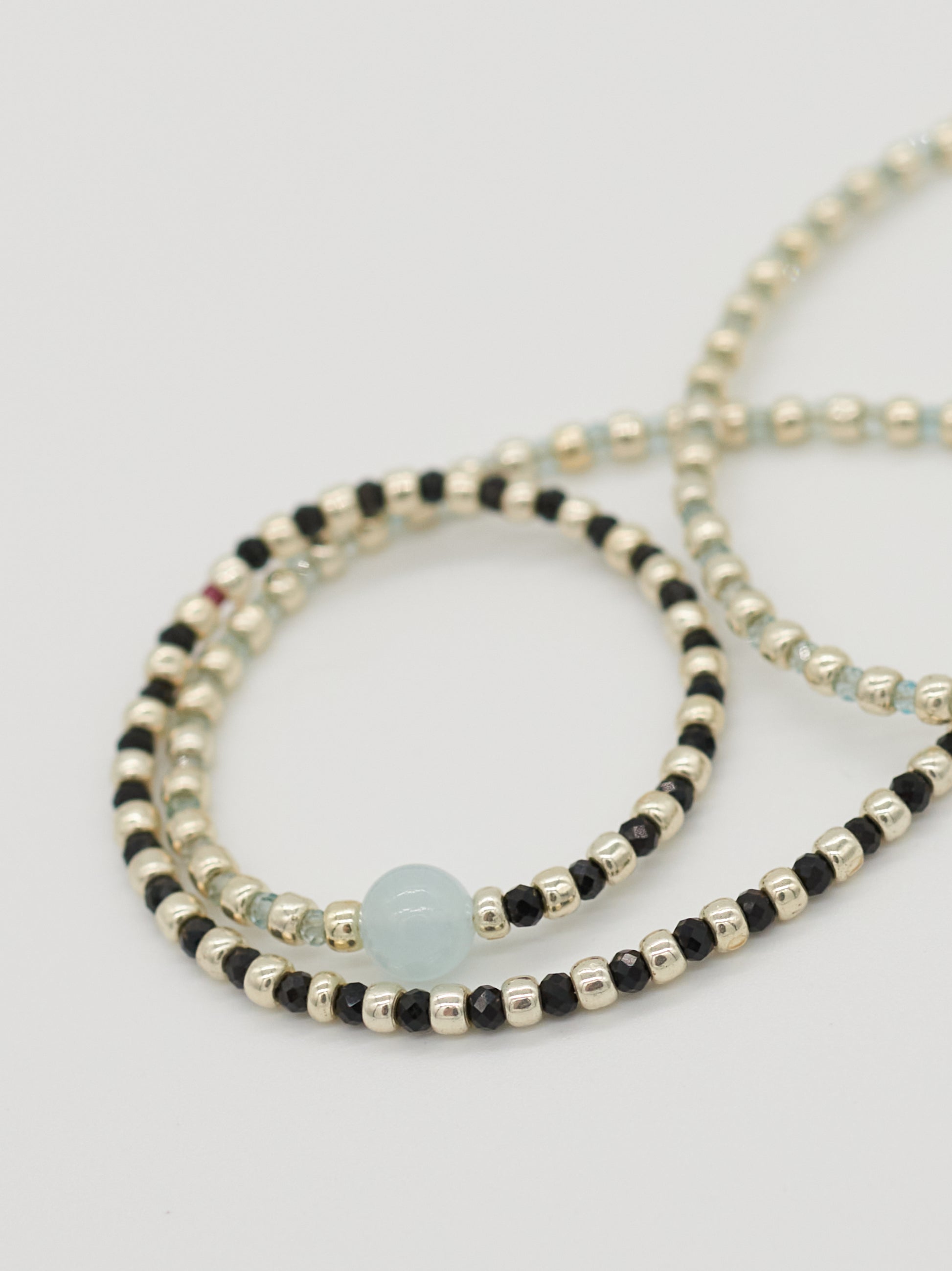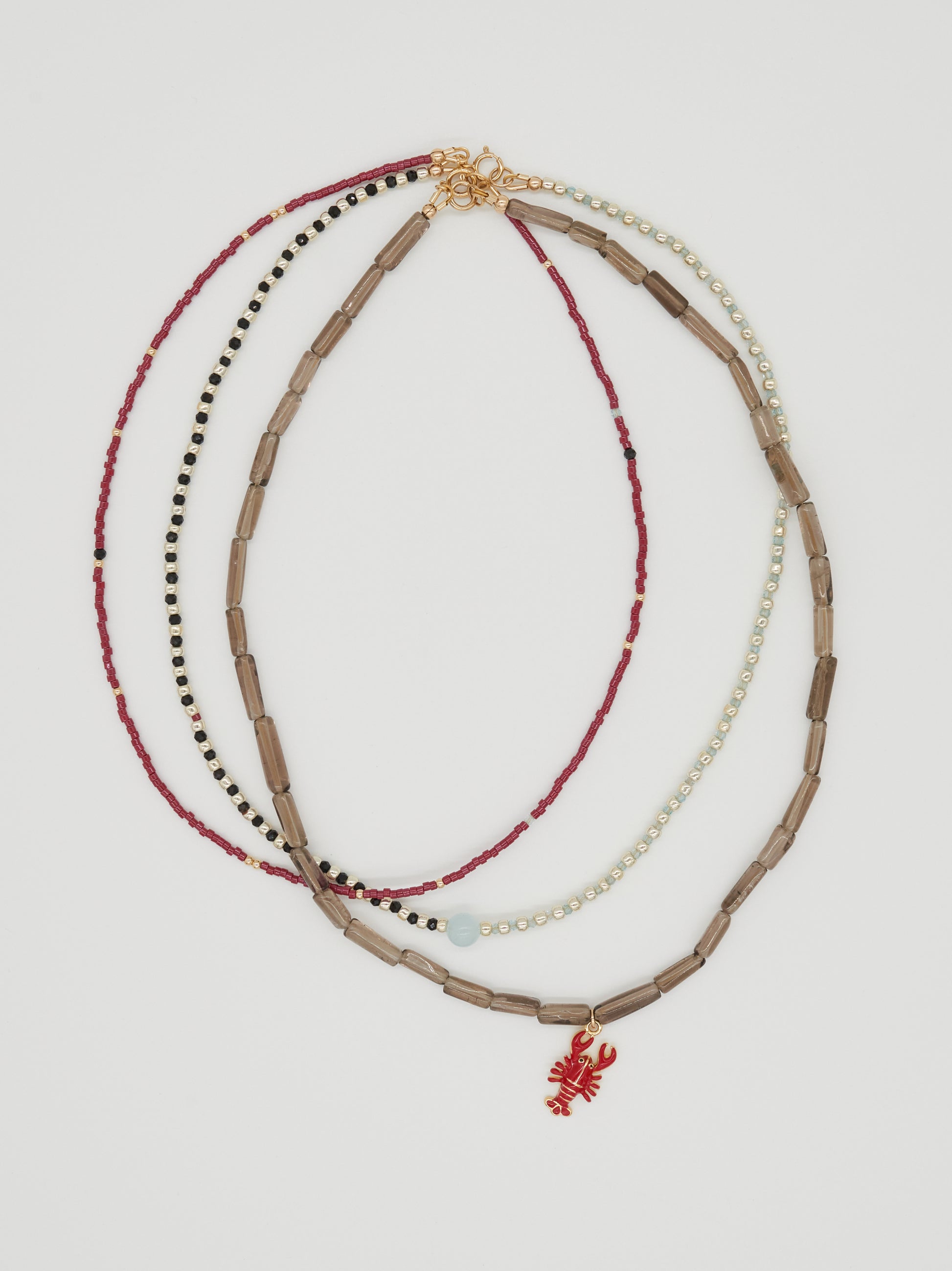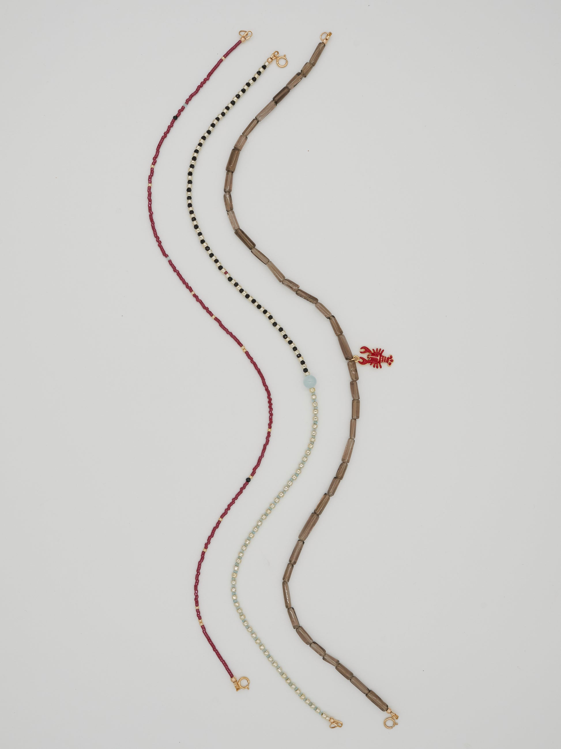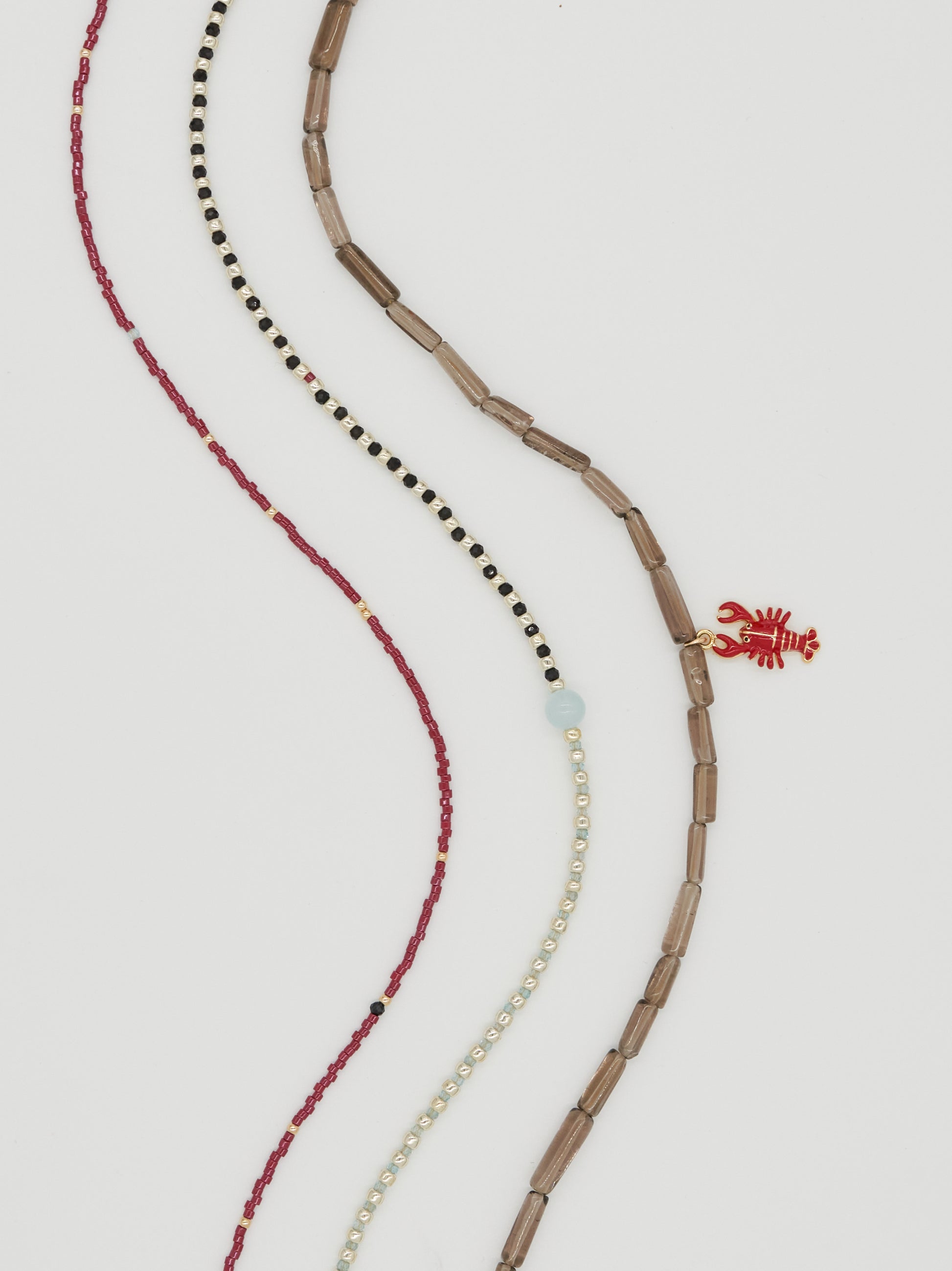 Red Line sits closest to the neck, a fine burgundy delica strand punctuated with subtle gold accents and tiny faceted black onyx and aquamarine details. Divide follows, split evenly between black onyx and aquamarine, spaced with silver seed beads to create rhythm and balance. Hold anchors the stack with smoky quartz tube beads, finished with a single lobster charm to add a cheeky wink.