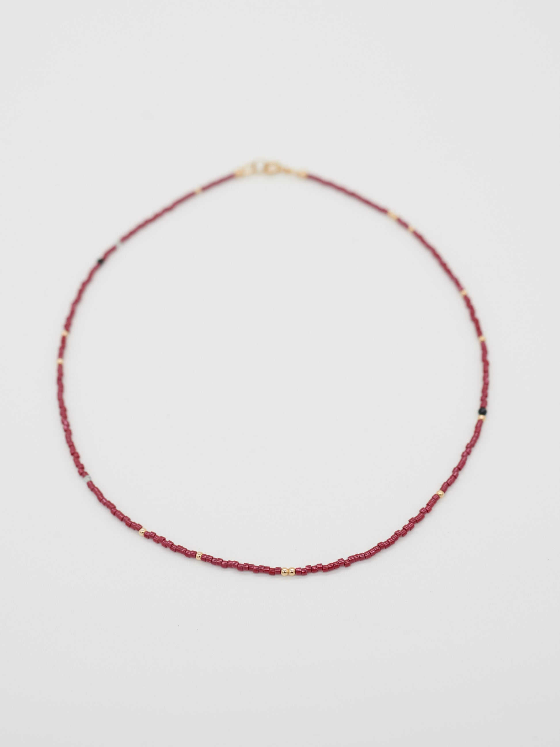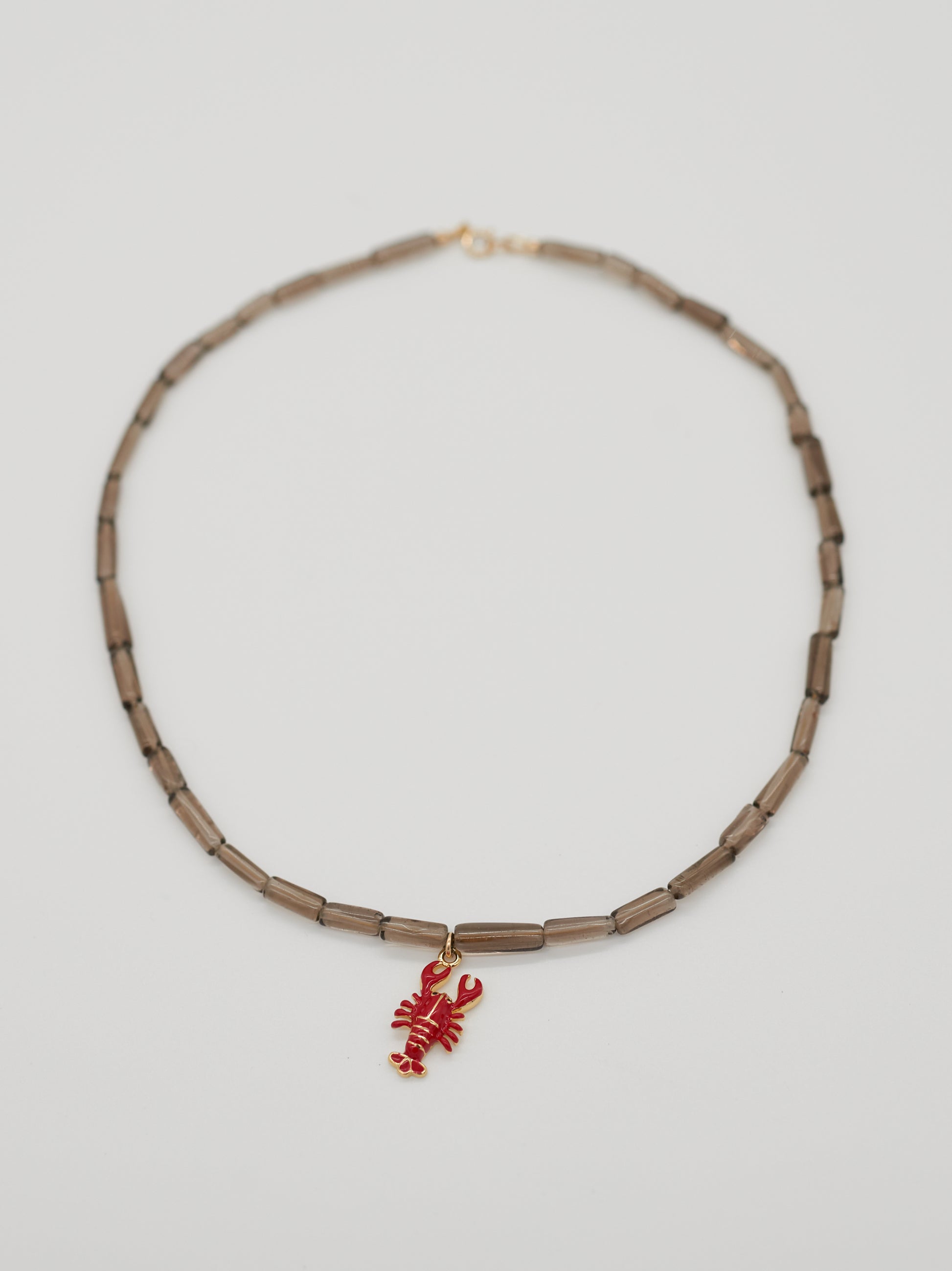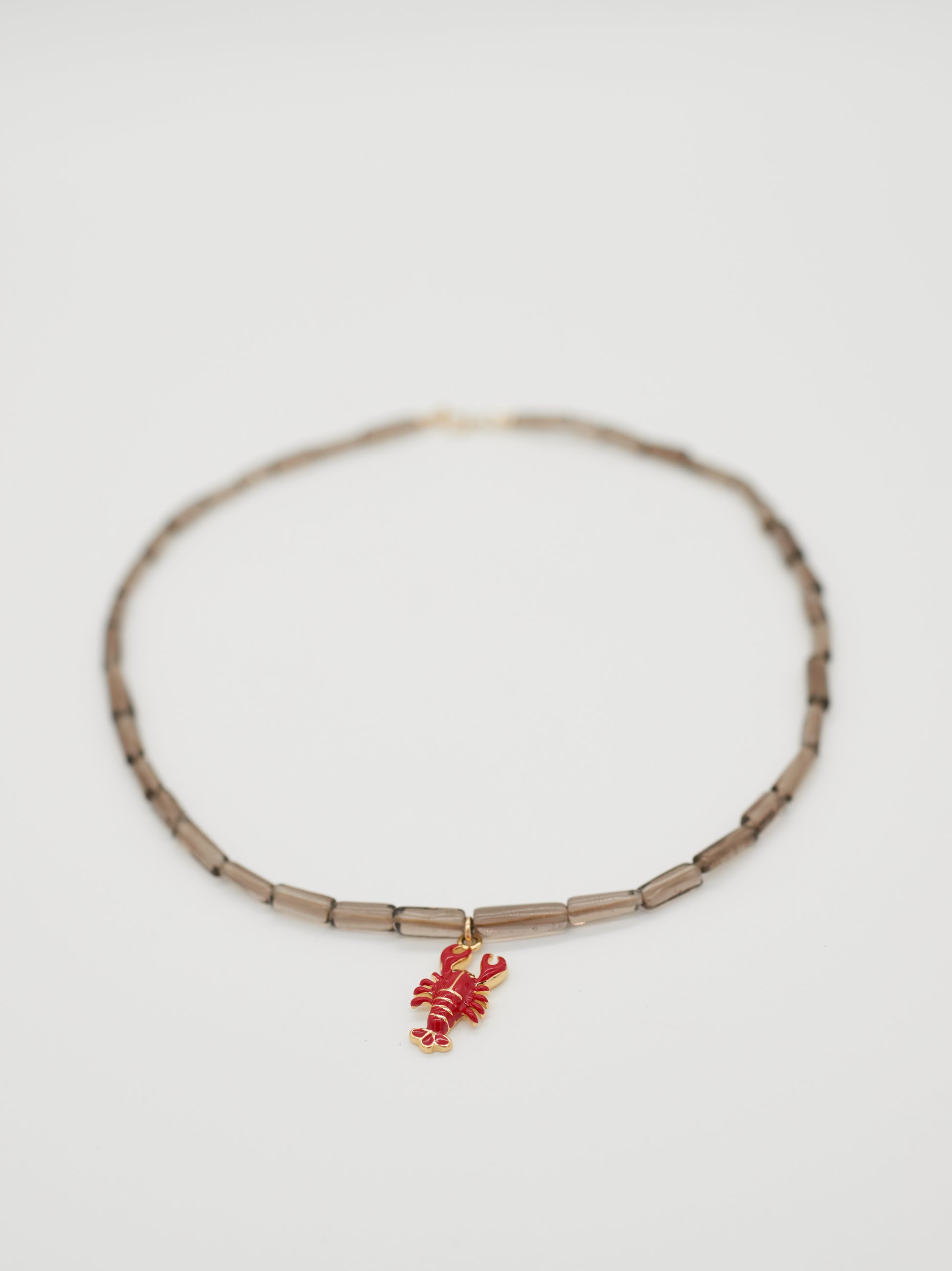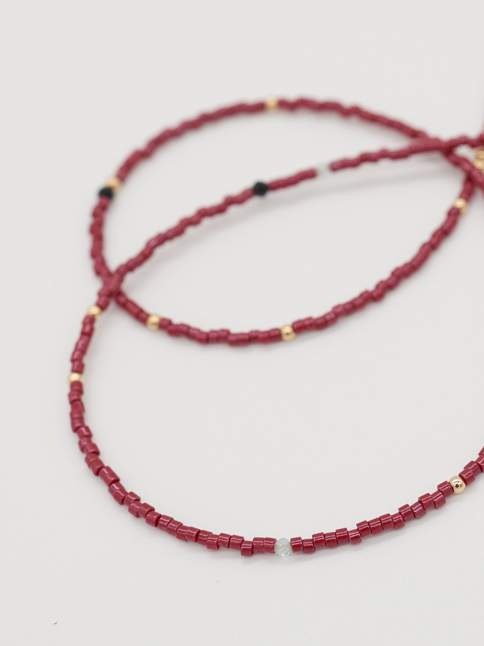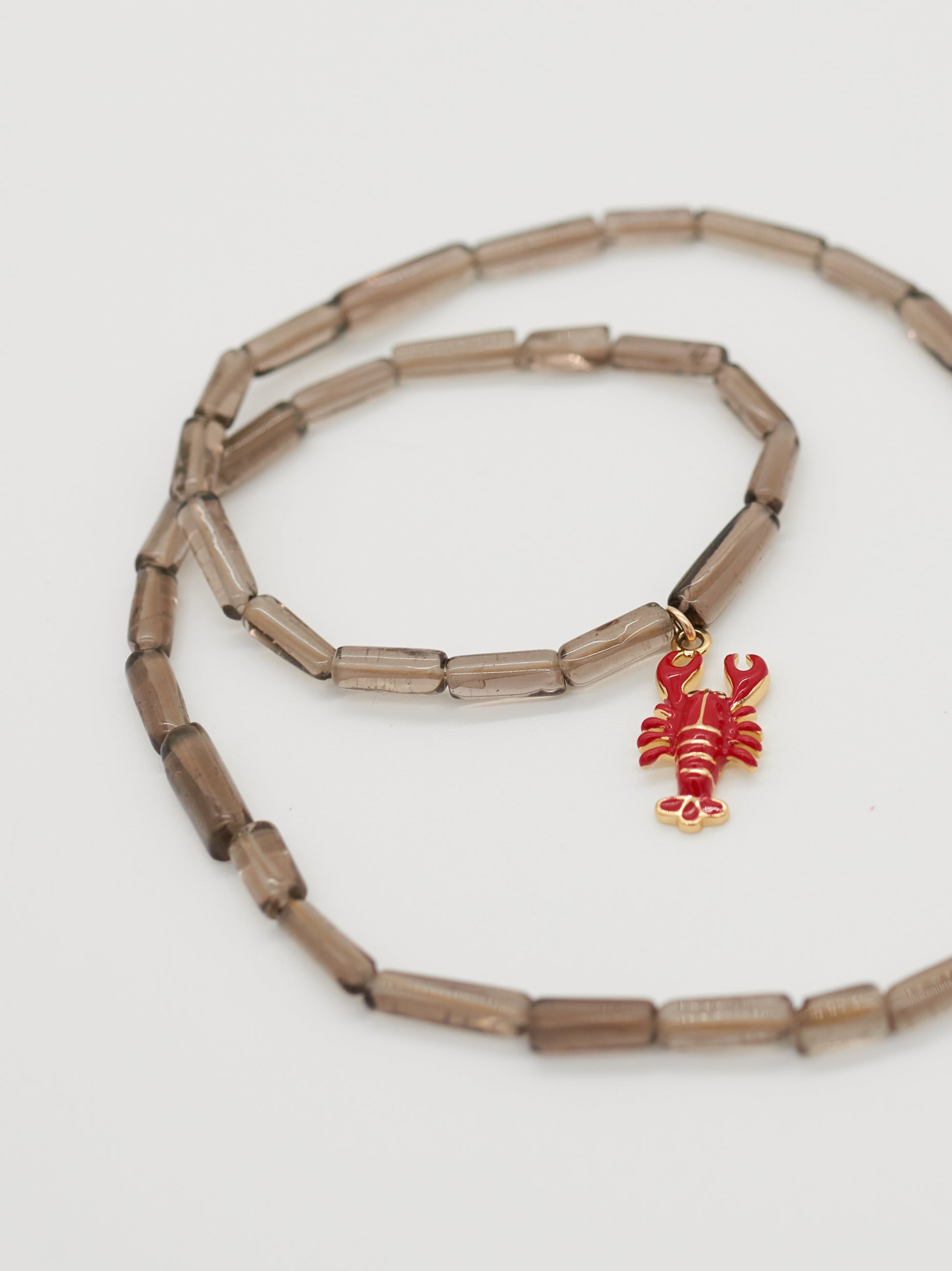 Red Line sits closest to the neck, a fine burgundy delica strand punctuated with subtle gold accents and tiny faceted black onyx and aquamarine details. Divide follows, split evenly between black onyx and aquamarine, spaced with silver seed beads to create rhythm and balance. Hold anchors the stack with smoky quartz tube beads, finished with a single lobster charm to add a cheeky wink.